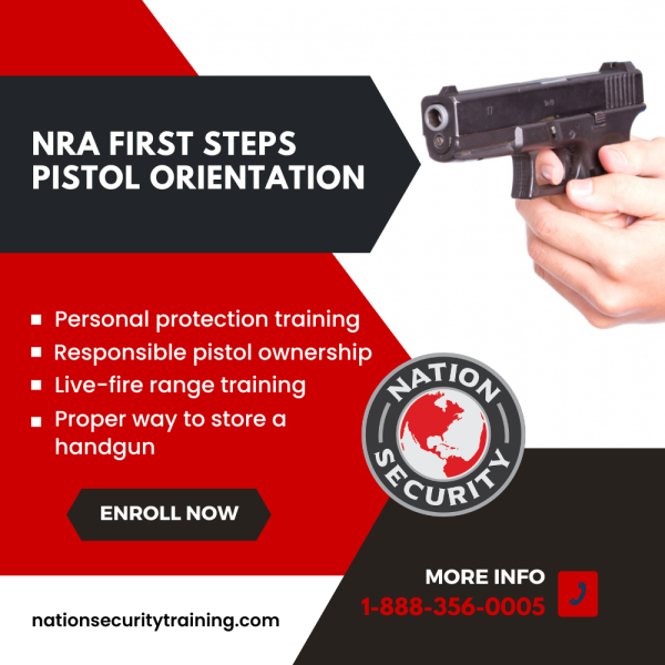 The NRA FIRST Steps Pistol Orientation Security Course is the only course in the industry designed to teach individuals who are new to firearms how to safely handle, use, and store pistols in their homes. This course focuses on the primary benefit the student gets out of the course, which is learning how to use and store a firearm safely in their home.